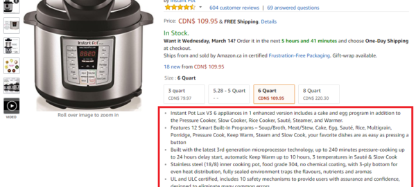 This Instant Pot takes what could have been a boring wall of text and breaks it up into six easy-to-read bullet points. People can quickly get the information they need and then take the next step to buy.