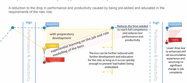 Development ‘after the fact’ does work. It can help mitigate the level at which an individual’s incompetence manifests. However, there will still be a lag in how long it takes for them to reach full competency in the new role. The smaller the gap between appointment and development the shorter the performance lag is. This is when we risk lost productivity/performance and employee motivation.