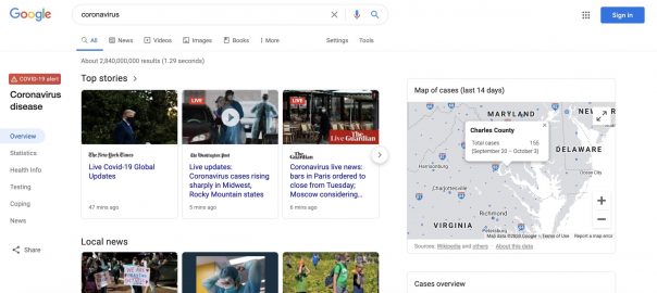 Google has rolled out some new features in response to COVID. For example, here’s a snapshot of the new coronavirus related features on the SERP. You can see a sticky menu on the left-hand side, and if you keep scrolling down you’ll find top stories, local news, cases overview, and more.