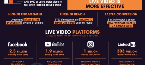 Going live can make people pay much more attention to your business’s ideas as only 20% of people finish an article, like this one, and most only finish the first quarter and 69% of users prefer video to text when learning about a specific brand or business. Live video can be much more effective than text in so many ways. Livestreams draw 6 times the engagement of viewers video-on-demand, 97% of consumers are willing to share live video on social media platforms, and 2 out of every 3 who watch a stream will purchase tickets to a similar or the same event.