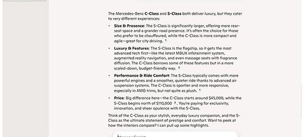 If someone wants to update their Mercedes-Benz car, the ad sequence begins in the Copilot experience. If someone is shown a car but asks online: “This car looks similar to