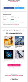 This Indiegogo notification email is spot on. Not only does it affirm the good feelings generated by the user donation, but it prompts customers to share on social – a win for both brand and buyer. Note the appropriately large buttons. The clean and crisp design makes sure the message comes through loud and clear, without distractions.