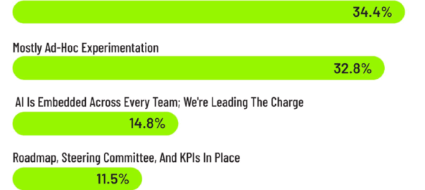The report shows agencies are deep into the exploratory phase when it comes to adopting AI, with a wide gap between intent and execution. A third of organizations say they’re still drafting a roadmap, while another third are in ad-hoc experimentation mode. That leaves just 16% who say AI is embedded across all teams — proof that full integration is still the exception, not the rule.