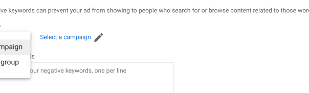 Whichever way you choose to add your negative keywords, you can apply them at the campaign or ad group level and select which one by clicking on the Select a campaign or Select an ad group link to the right.