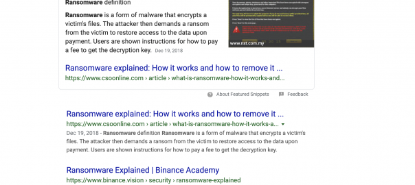 You may notice that in this case, position zero was pulled out of the content of search result number one. Often, this is the case. However, there are occasional SERPs where position zero is pulled from result number two. While your page may be ranking for number one, a position zero ranking requires that your website is high-ranking and lays out the answer to the question clearly and plainly. In the example above, my query “ransomware explained” also happened to be the exact title of the position zero article.