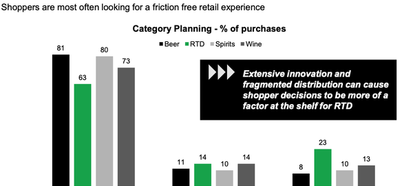 Among other findings, the data show that RTD purchases at the retail level are the most impulse-orientedâat 23%âcompared to 13% for wine, 10% for spirits and 8% for beer.