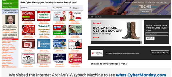 Ten years ago was when we first started to notice that sales started online the Monday after Thanksgiving, and the phrase “Cyber Monday” was coined. With more devices now, than ever, we have access to shop on computers, smartphones, and tablets. The NRF looked back in the Internet Archive’s Wayback Machine and found the difference of what cybermonday.com looked like in 2006 and in 2015.
