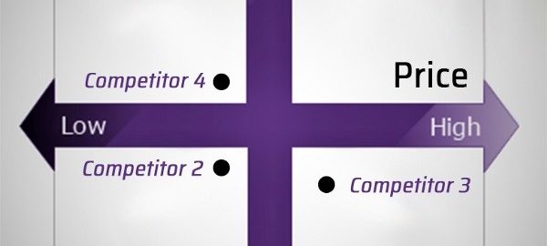 For example, businesses can apply price and quality for most markets; but the map should focus on the primary consumer needs or product benefits you want to understand, which will vary depending on the market. See below for an example of a positioning map.