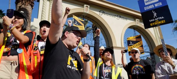 More than 60,000 members of the Screen Actors Guild-American Federation of Television and Radio Artists went on strike July 14, joining screenwriters who had walked off the job more than two months earlier. It was the first time the two unions had been on strike together since 1960. Studios chose to negotiate with the writers first, striking a deal that their leadership marked as a major win and bringing that strike to an end on September 26.