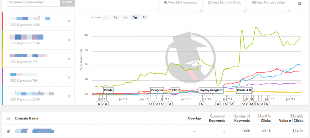 Spyfu gives you in-depth views of your competitors rankings, keywords, clicks, and their evolution over time. It’s a data junkie’s heaven! Here’s a sample of what you’ll see above the fold when you first look up one of your competitors.