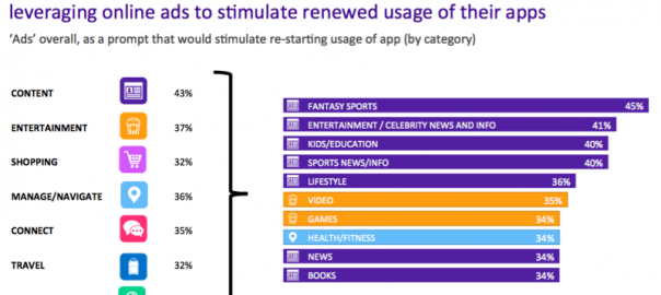 In addition to being a source of app downloads, Yahoo found that ads were an effective way to jump-start dormant app usage across most categories. The chart below shows the success rates of developers in different app categories in re-engaging app users with advertising.