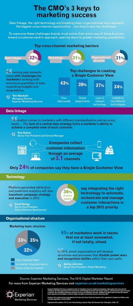 Louis FoongJune 4, 2015 As a CMO, you’ve got your work cut out for you. So why make it harder on yourself? As shown in this infographic, researched and created by Experian, 43% of interviewed CMOs identified poor data quality as a top challenge to their work; siloed departments clocked in at 39%, while 37% … Continue reading Interesting Infographics: The CMO’s 3 Keys to Success
