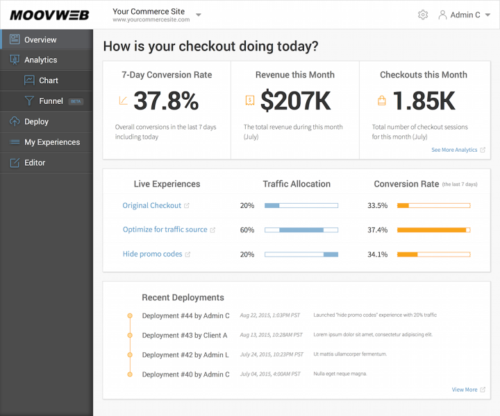 New product offers A/B testing, user flow management, analytics, and best practices. Barry Levine on October 6, 2015 Shopping cart checkouts are the Heartbreak Hill of marketing. It’s where potential buyers hit a wall of indecision and leave their chosen products, unbought. This week, website optimizer Moovweb is launching MoovCheckout, a mobile web toolset to … Continue reading Site-Optimizing Moovweb Launches Suite Of Shopping Cart-Optimization Tools