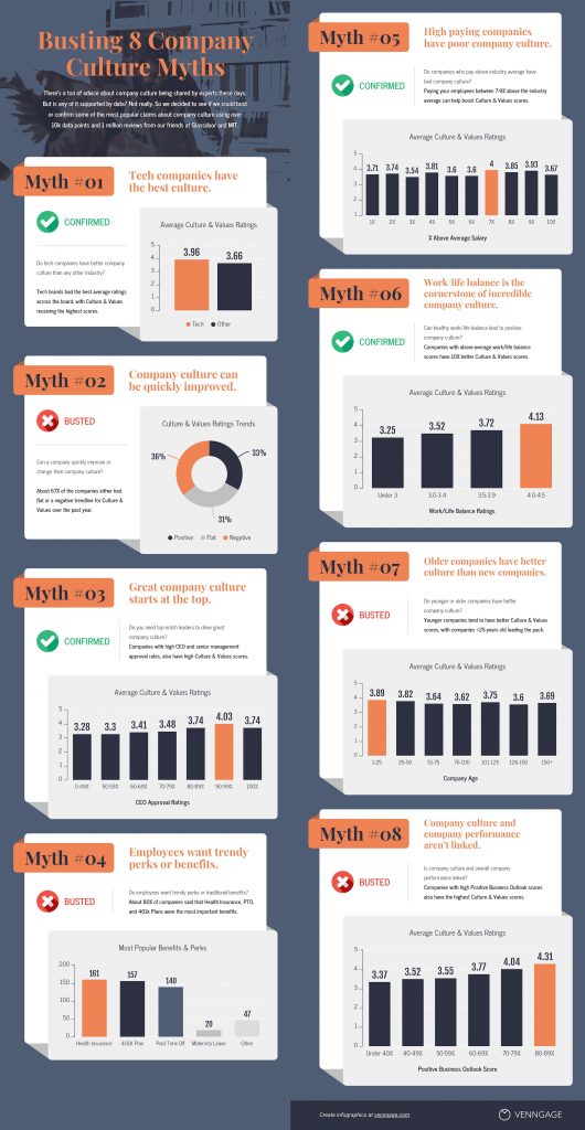 Alice Corner — October 14, 2019 Made with Venngage Infographic maker Company Culture describes the overall atmosphere of a culture. And whilst this might not seem important, it’s time to take company culture into account, especially if you’re trying to recruit millennials. Company culture references the specific ‘vibe’ each company has grown in to. This … Continue reading Busting Company Culture Myths [Infographic]