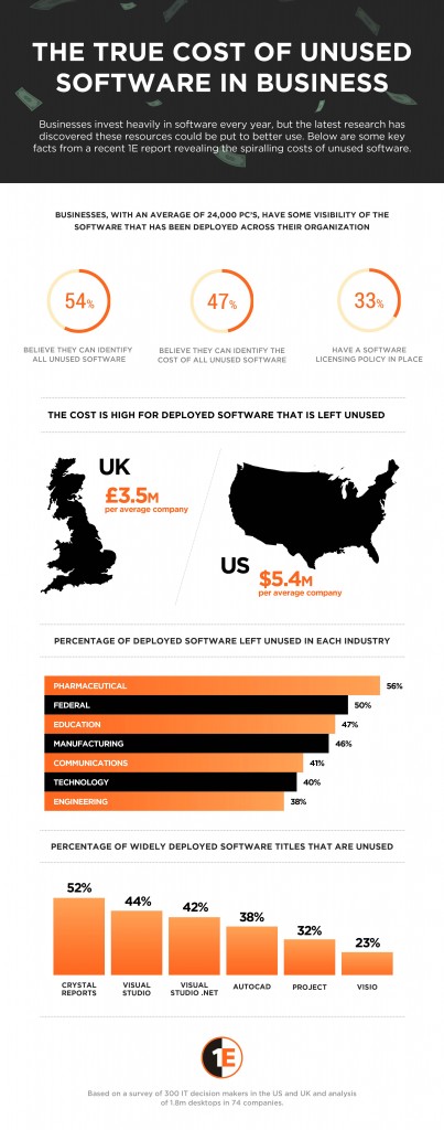 Matt RawlingsMarch 6, 2015 A new report has revealed that businesses in both the UK and US are spending millions every year on redundant and unused software. The study conducted by the company 1E, reports that in some sectors, up to 56% of purchased software is not utilised. That’s a sizeable percentage, and a pretty … Continue reading The True Cost of Unused Software in Business [Infographic]