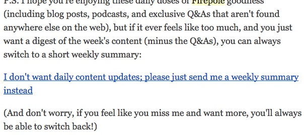 Danny Iny and the folks at Firepole Marketing send a LOT of email. In fact, they send on a daily basis. Some people love it, while others just don’t have the time to read that frequently. For the busier folks, Firepole Marketing includes this simple message at the bottom of every email: