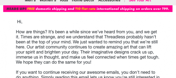 Here’s an example of a creative email from Threadless, asking if the recipient is still interested in getting their campaigns.