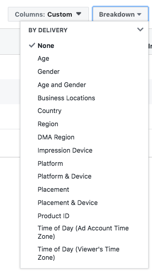 Facebook Ad Manager‘s reporting includes 12 preset reporting option, that you can find in the column section on the top right.