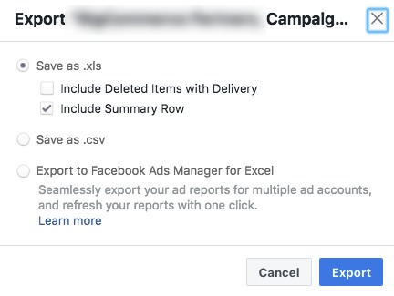 Facebook Ads Manager allows you to export your data in a CSV, Microsoft Excel file (.xlsx) or by sharing a link to that data with people in your ad account.