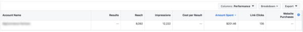- Table view of your campaigns, grouped by objective. If you’re running campaigns with different objectives, you can analyze how these campaigns perform at a grouped level. This view includes the following metric: results, cost per results, reach and amount spent.