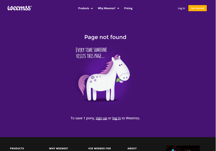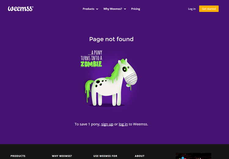 While Larry likes to turn ponies into unicorns, weemss takes a different approach by turning ponies into zombies when you hit their error page! Even better, they offer to help you save a pony…by signing up or logging into their software.