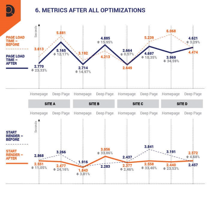 As you can see, this had a more dramatic impact than our code cleanup efforts, and for two of the sites we saw dramatic performance improvements of 20 to 30 percent, with just two pages seeing an uptick in start render time.