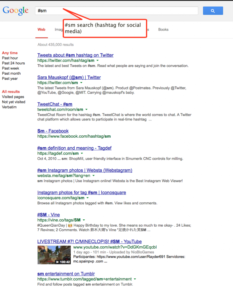 A Google search for #sm returns results from social networks and the web.