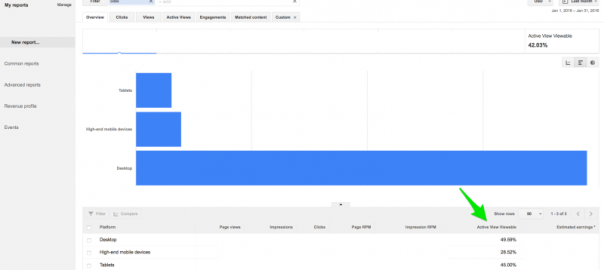 Google defines an Active View as an ad impression where at least 50 percent of the ad’s pixels are visible on the user’s screen. You can view your Active View metrics by device type in the Google AdSense dashboard to see if your Active View rates are significantly lower on mobile devices.