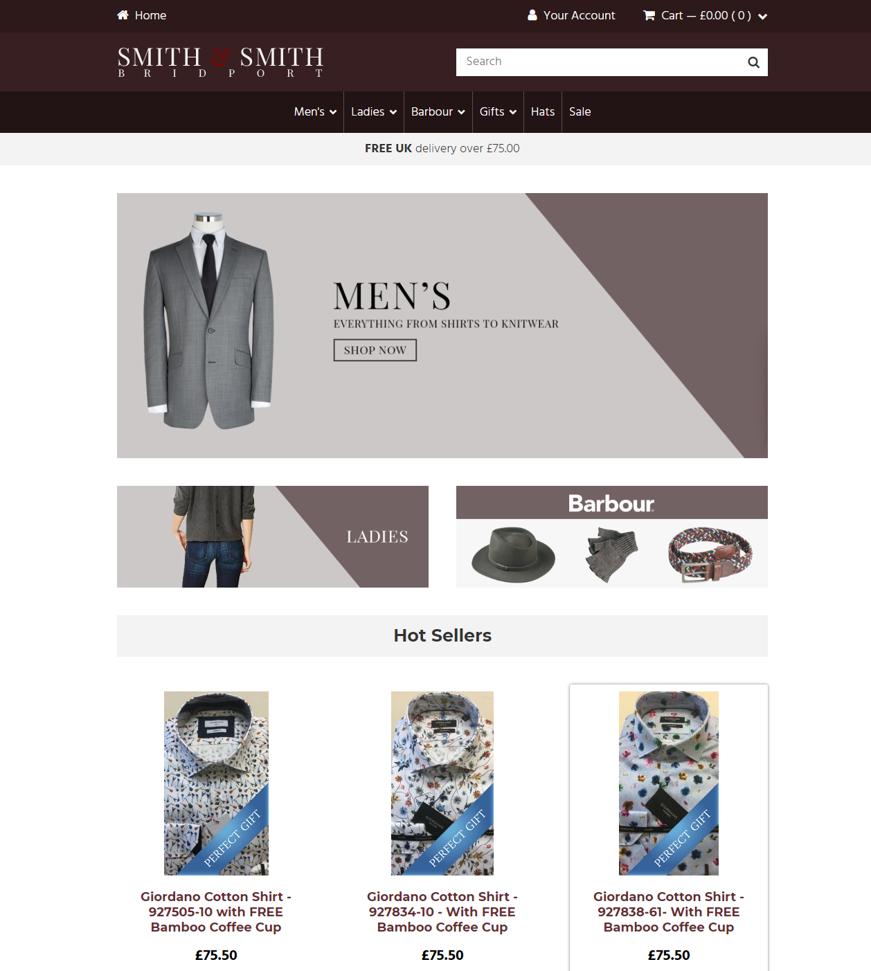Whereas Smith & Smith, while still a clothing shop have chosen a colour scheme more fitting to their male target audience, but are still using mainly images to communicate with the viewer.