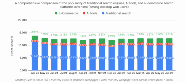 Traditional search continues to dominate user activity, according to a new report, with AI and ecommerce search tools running behind.