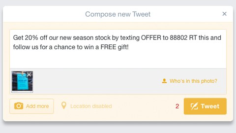 Encourage interaction with your offer to increase the visibility of the post and your business awareness by offering money off or a prize if people share or retweet your campaign.