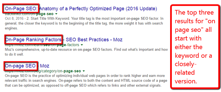 Notice how each of them starts with the target keyword or a closely-related version. The second result, in fact, is a great example of how you can use related words (in this case, “ranking factors” and “seo”) in your title to make it rank higher.