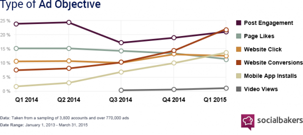 Nevertheless, more video views – as an ad objective – continues to steadily climb from Q3 2014 to Q1 2015.