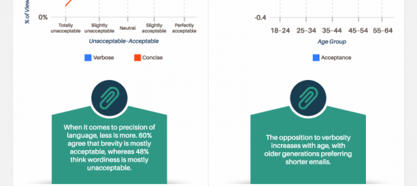 - The opposition to verbose emails increases with age: 70% more respondents between the ages of 55 and 64 find the practice unacceptable compared with those between 18 and 24.