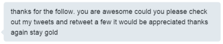 Side note: If you scroll back to the top, you’ll notice I said “I will unfollow 90% of those who send me one within minutes of my reading an auto DM.” What about the other 10%? I have received messages which resonated, provided value or, based on the source, weren’t seen as spam.