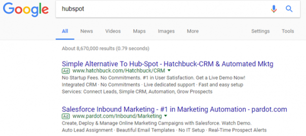 HubSpot doesn’t have an ad on this page, but they’re the first organic result (remember what I said about all that real estate? Read ‘em and weep). Both competitors with ads served for my search are deploying similar tactics—hammering home difference in cost and a demo offer—with one exception. One is attempting to trick Google’s Quality Score algorithm (and searchers, for that matter) by implanting an alternate spelling of HubSpot. Don’t do this. While it may save you a buck, it may result in ad disapproval or suspension (plus the dishonesty is a bit uncouth).
