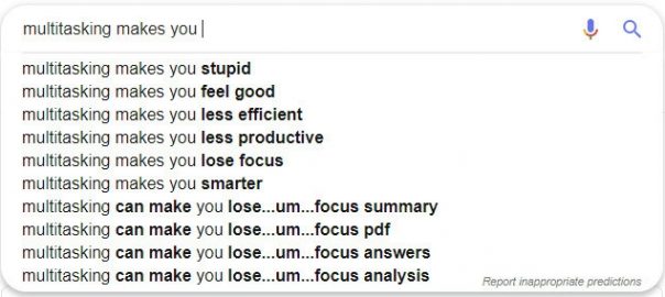 In my business, the phrase ‘multi-tasking makes you stupid’ is often quoted. So, I typed the phrase into Google to see what it came up with. Well, that’s not quite true. I typed the phrase ‘multi-tasking makes you’. This is the list I got back.