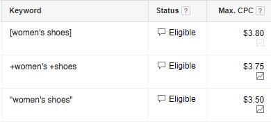 It’s important to note, however, that even with a just one keyword in your ad group you can still have multiple match types. For instance, let’s say your keyword is “women’s shoes.”
