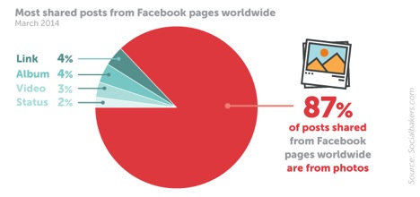 Looking at 30,000 brand Facebook pages, a study found that 87% of the posts with high sharing metrics included images. No other content type even came close.