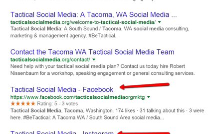 for having profiles on the big social sites – URLs. Every profile, in fact every post, creates a new URL. Profile URLs are indexed and do show in search engine page results (SERPs). More URLs means a greater opportunity to be found. If you’re site is poorly optimized for SEO (heck, even if it is) you’re not relying solely on it getting pulled. I’ve even found cases when my social profiles ranked higher than this site!